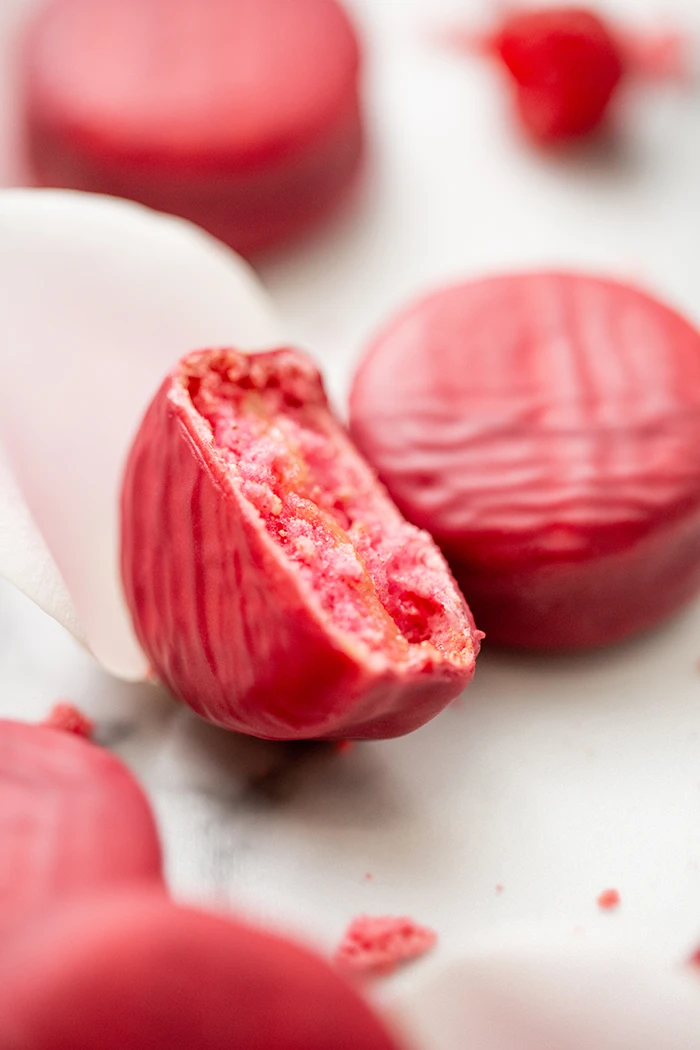 قشرتان رقيقتان من حلوى الماكرون الوردية، مملوءتان بكريمة الورد ورائحة الورد.